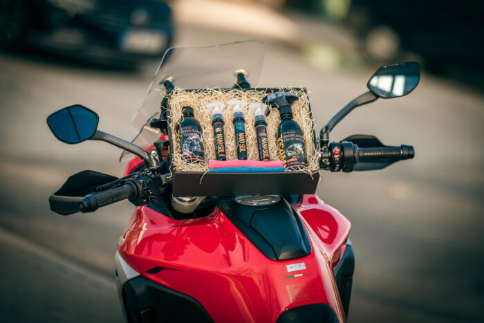 Dárkový balíček KOMPLETní péče o motorku, který nabízí kompletní péči o vaši motorku. Je zabalen v elegantní dárkové krabici s mašlí. Balíček je pečlivě sestavený s ohledem na potřeby motorkářů, kteří touží po tom, aby jejich motocykl zářil čistotou a byl v perfektním technickém stavu.