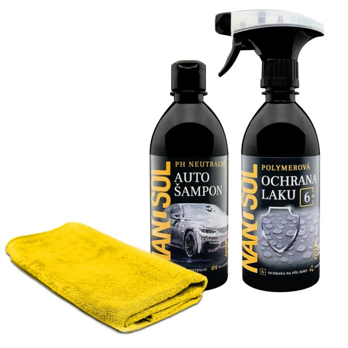 Minimalistická sada autokosmetiky pro mytí auta s Polymerovým voskem. Kvalitní Autošampon na mytí a Polymerový vosk 6+. Šamponem umyjete, usušíte. Takovým lepším nanovoskem je Polymerová ochrana 6+ je na ochranu laku zajistí perfektní a zářivý vzhled laku auta včetně exteriérových plastů a světel.